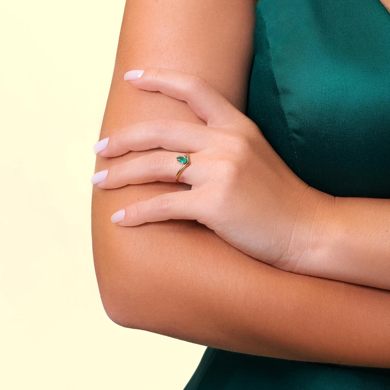 O Anel Aurora Prime em ouro amarelo 18k exibe um design arquitetônico em “V”, coroado por uma esmeralda em formato gota e um reluzente ponto de luz em topázio incolor.
