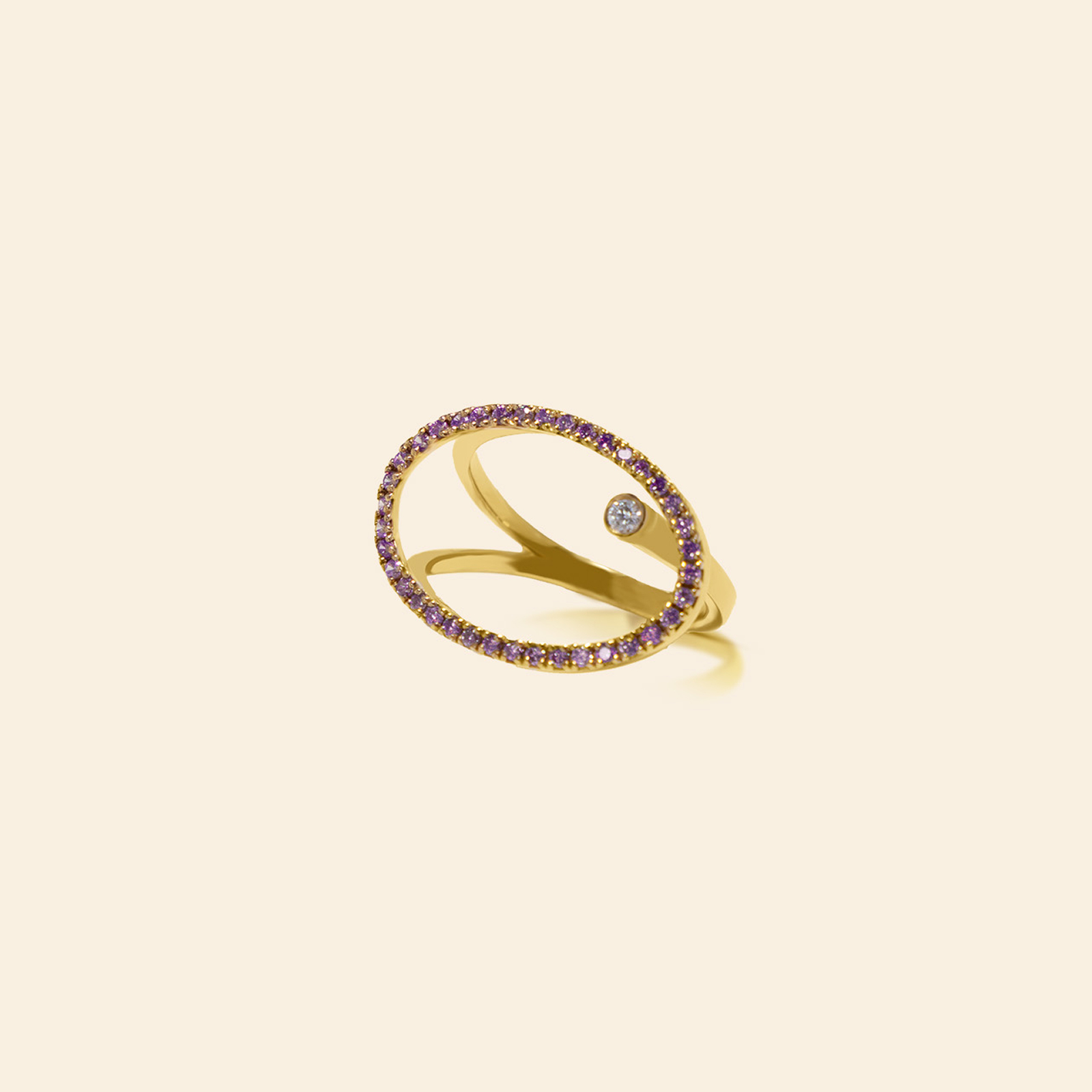 O Anel Dualis é uma joia assimétrica, em ouro 18k. Possui um design circular e elegante, cravejado com brilhantes roxo vibrante e um delicado ponto de luz em moissanite.