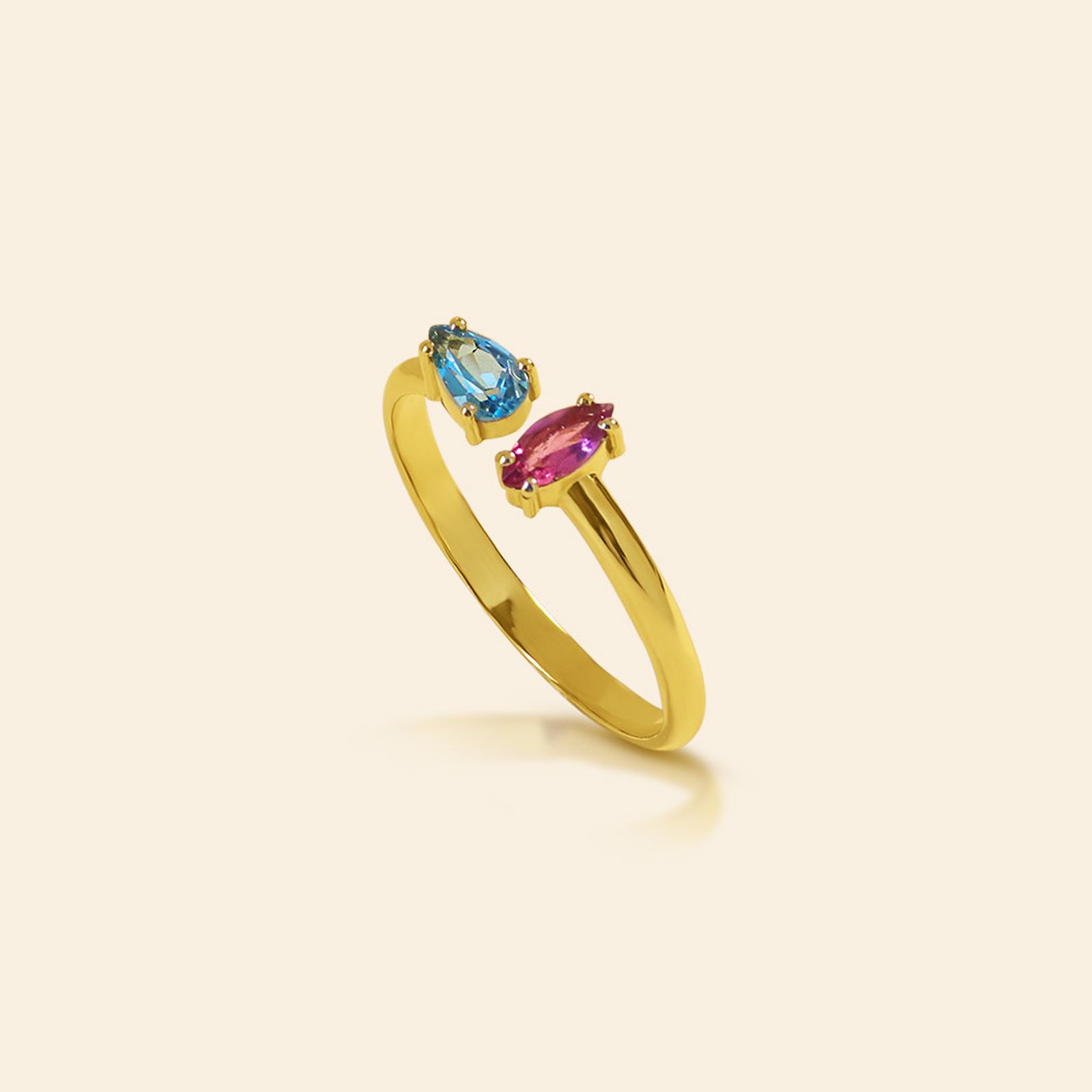 O Anel Dueto Alvorada em ouro amarelo 18k celebra o encontro cromático da turmalina rosa com o topázio swiss, em um design minimalista e anatômico.