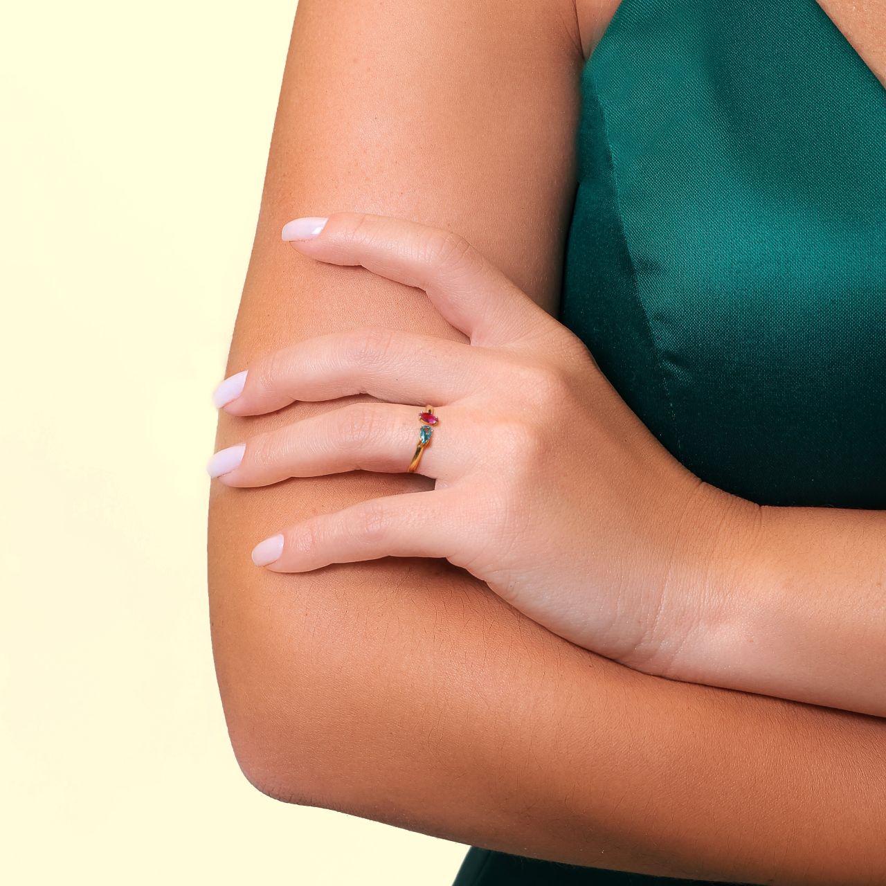 Este anel é a tradução em ouro e gemas dos primeiros reflexos do amanhecer. Os dois pontos de cor brilhantes contrastam no aro como os primeiros tons rosados e azulados que pintam o céu da alvorada. Com um aro arredondado extremamente confortável, é uma joia pensada para acompanhar você em todos os momentos, iluminando seus dias com sutileza.