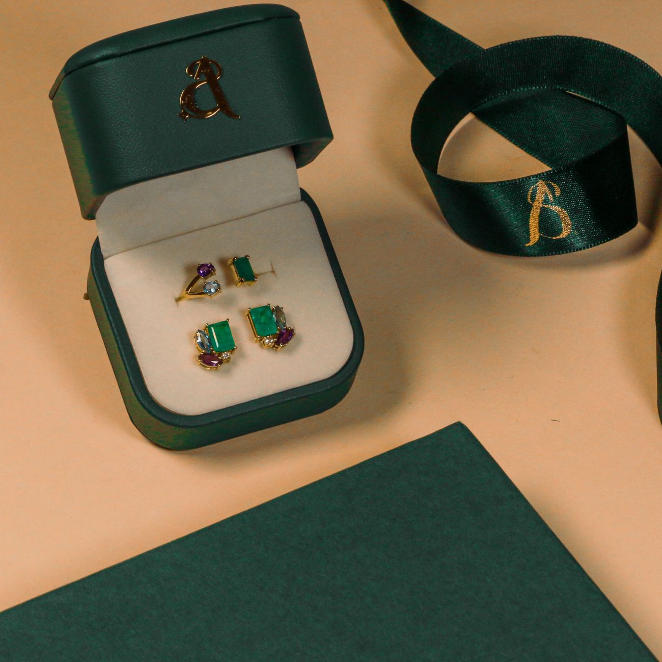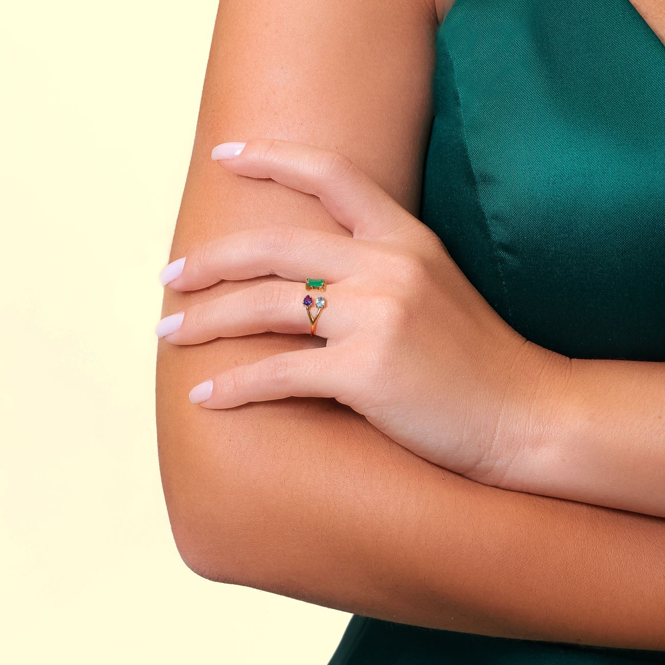 Seguindo as curvas de um horizonte suavemente iluminado, este anel é um convite à contemplação. O Anel Tríade Boreal harmoniza tons de verde, azul e violeta, criando uma aura de equilíbrio e calma. Uma peça autoral e elegante exclusivamente singular como qualquer outra joia.