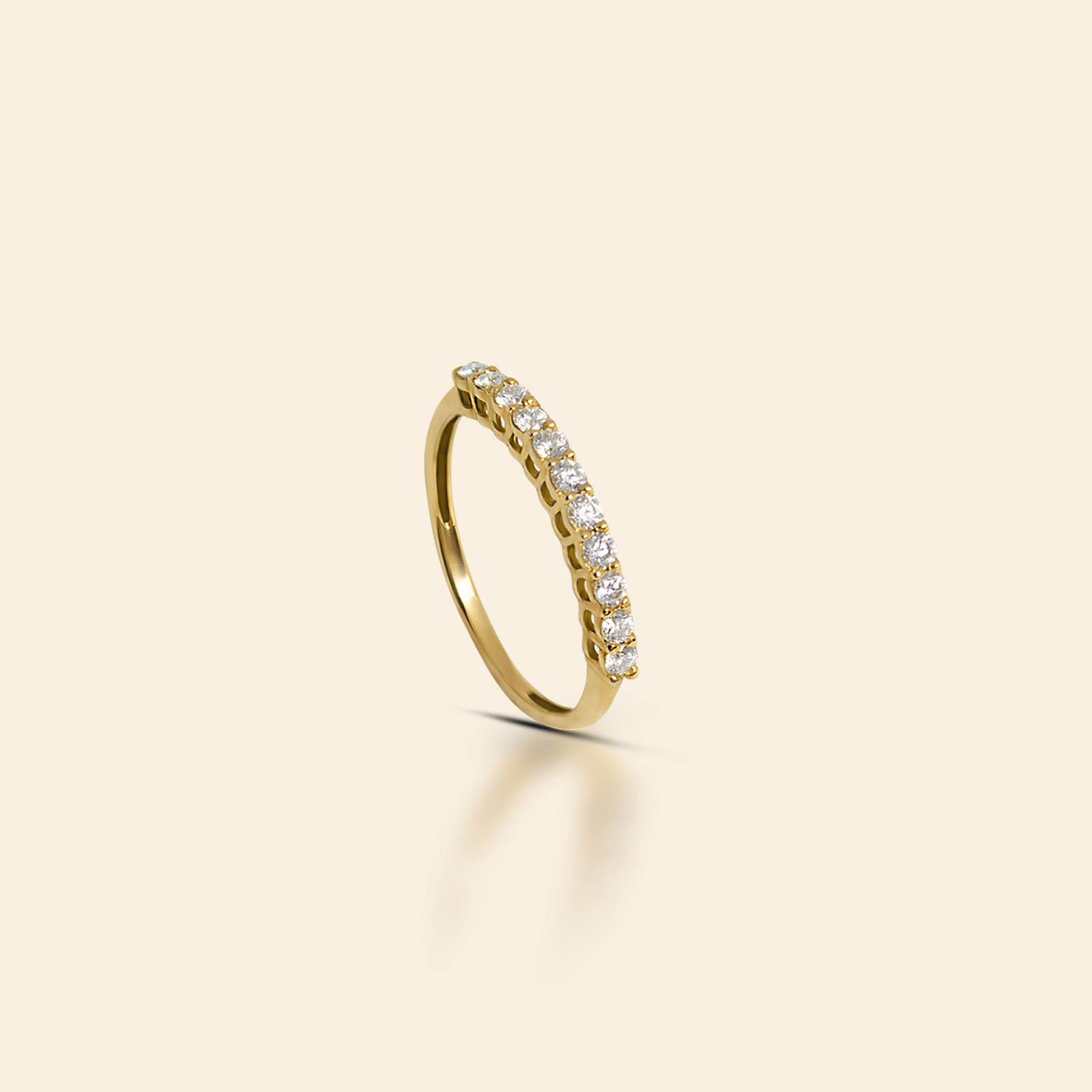 A Meia Aliança Eterna Luz em ouro 18k celebra o brilho que atravessa o tempo. Uma meia aliança clássica cravejada com Brilhantes, feita para simbolizar união e amor, perfeita para marcar histórias e combinar com um solitário.