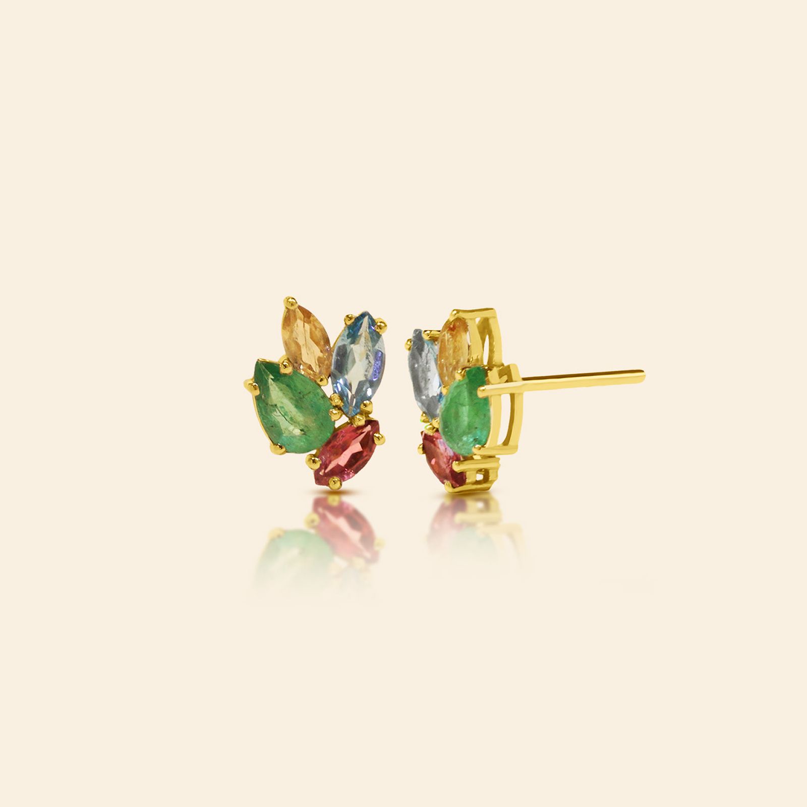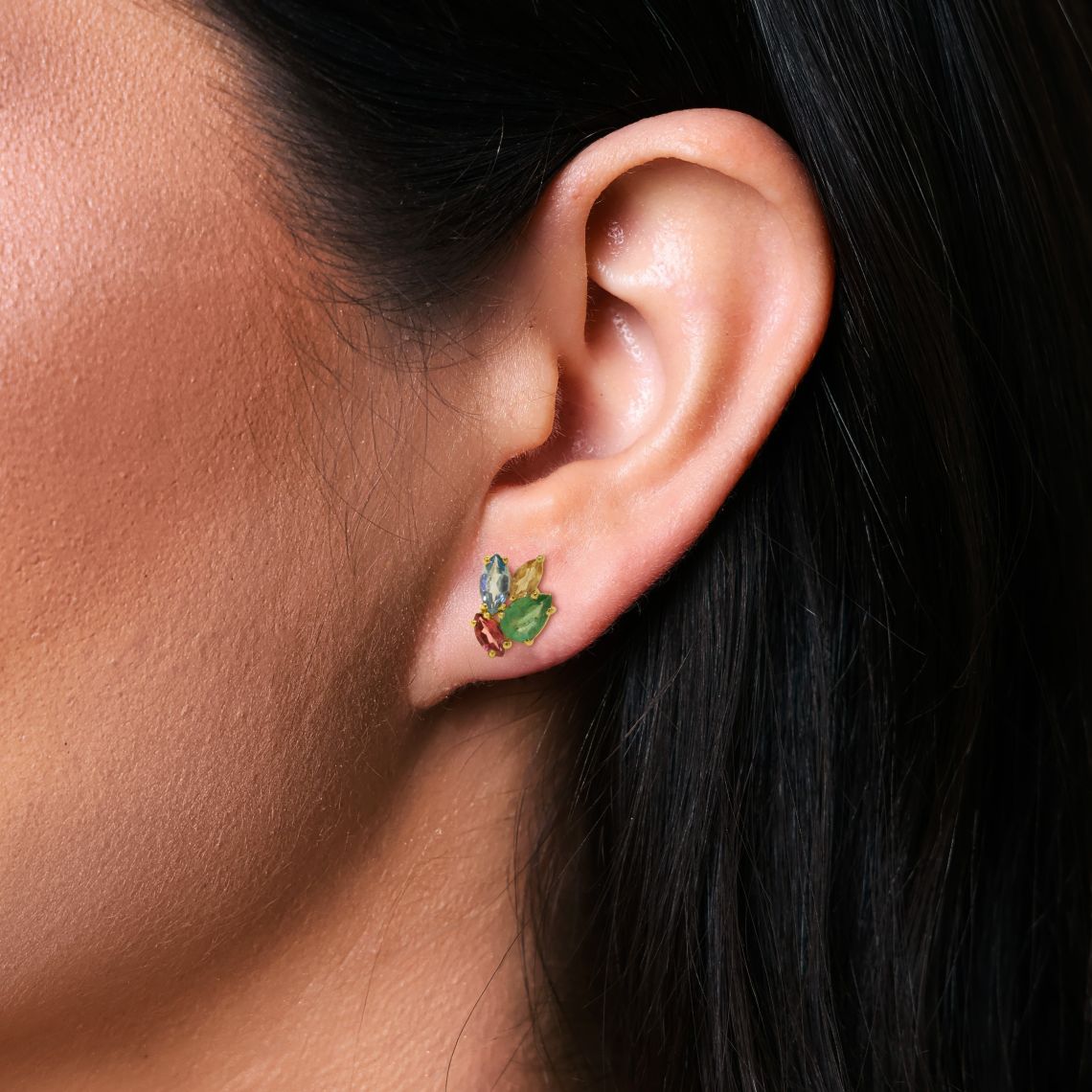 Luminoso e vibrante, o Brinco Aurora Âmbar em ouro 18k traz o calor único do topázio imperial contrastando com a esmeralda, turmalina rosa e topázio swiss.