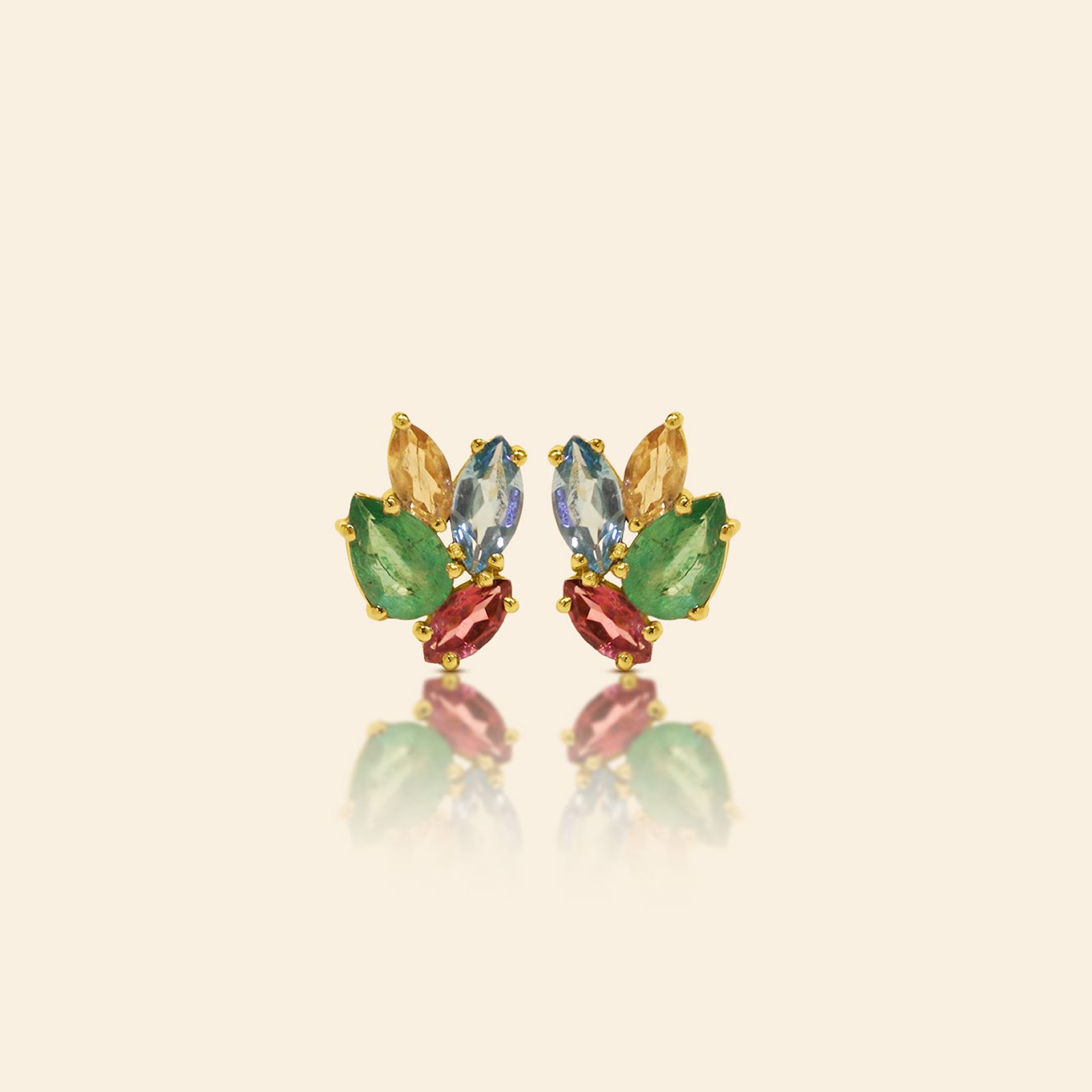 Brinco Aurora Ambar Esta peça celebra o exato segundo em que o sol aponta no horizonte, banhando o céu com tons dourados. Em ouro 18k, seu design autoral desenha o amanhecer com um magnetismo irresistível. No coração da peça, o calor radiante do topázio imperial se funde ao frescor natural da esmeralda e ao romantismo da turmalina rosa.