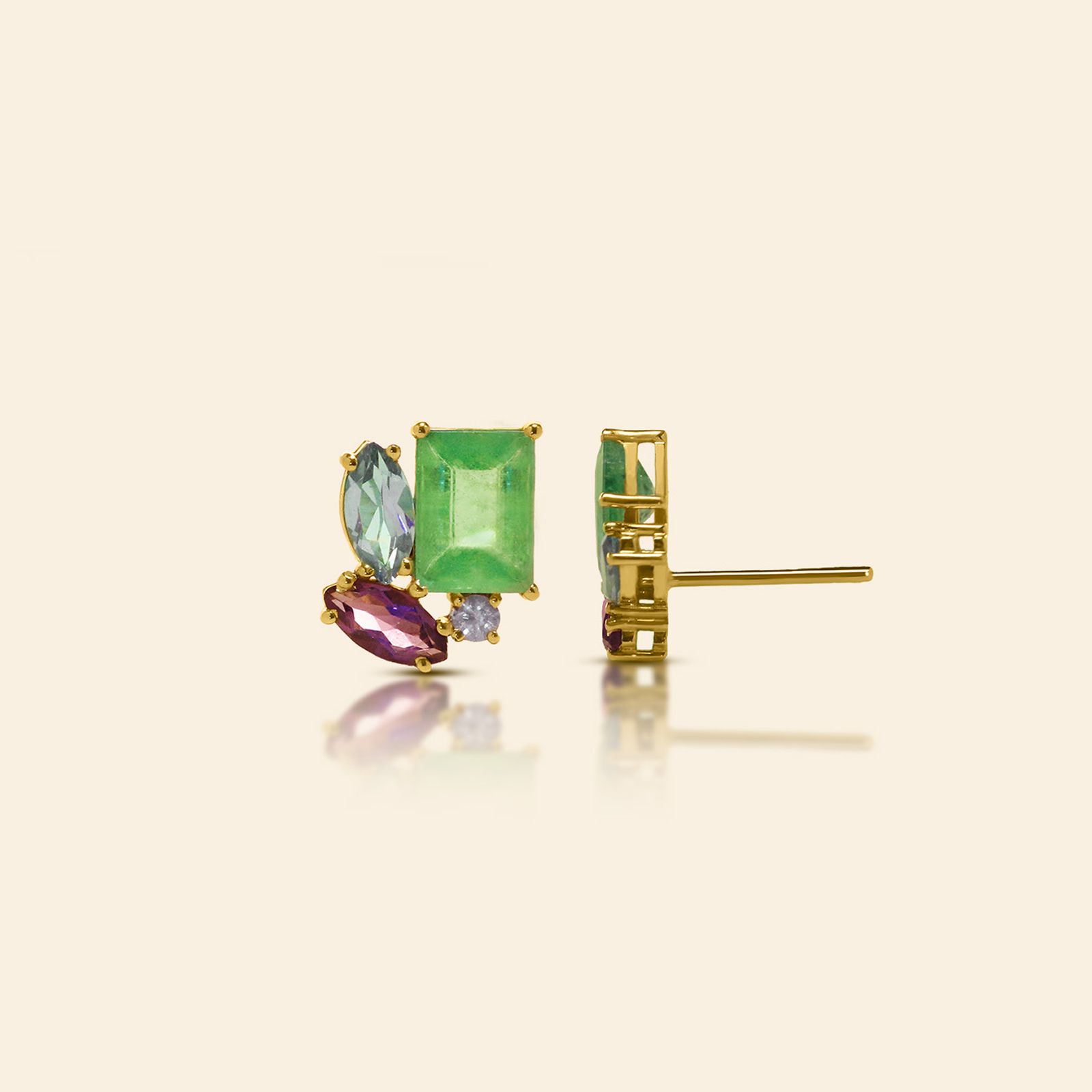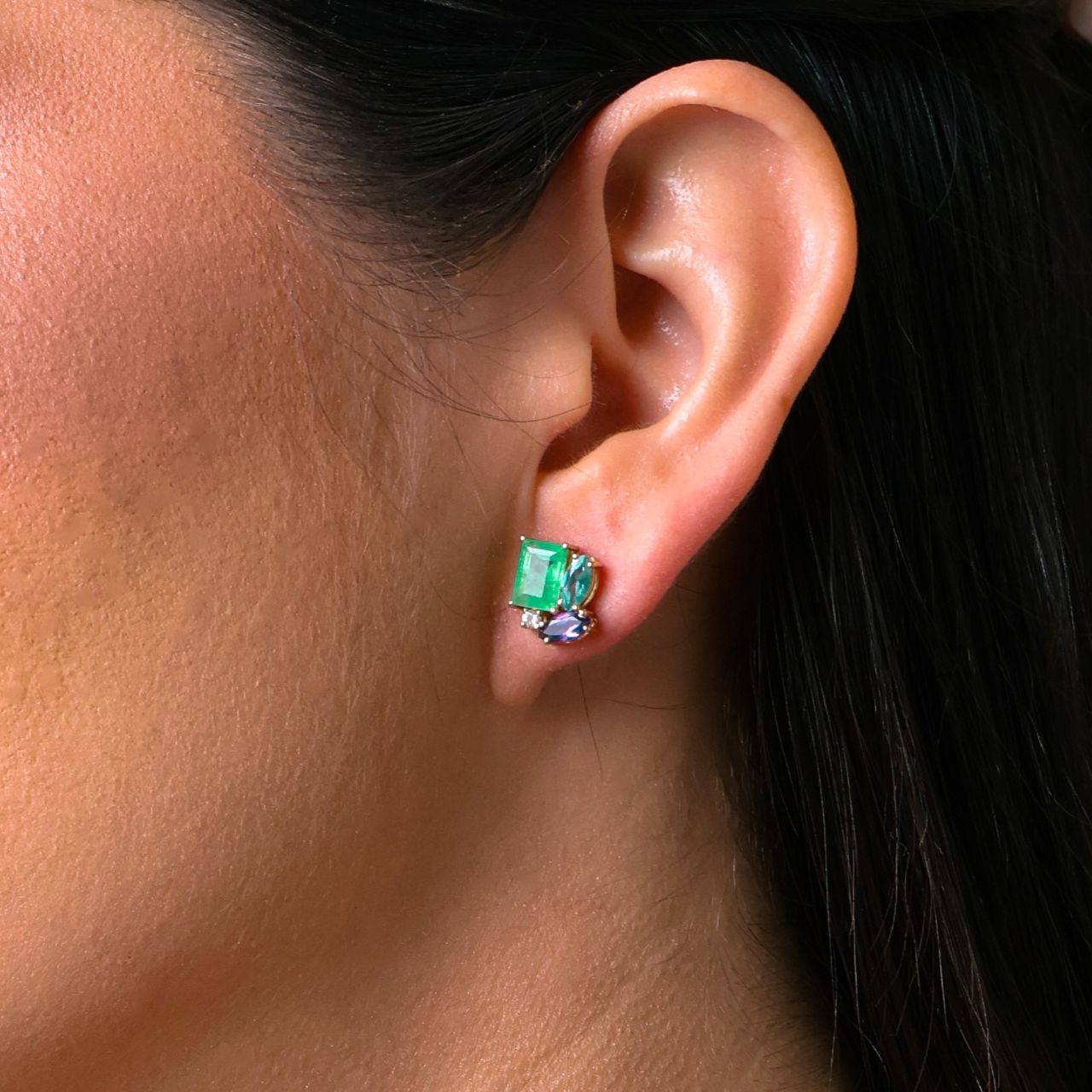 Este par de Brincos Aurora Horizonte traduz a poesia visual de um jardim ao amanhecer. O protagonismo da esmeralda retangular traz sofisticação ímpar, enquanto as gemas em lapidação navete criam um contraste etéreo de azul e violeta. É a joia contemporânea revelando uma sofisticação feminina e natural.