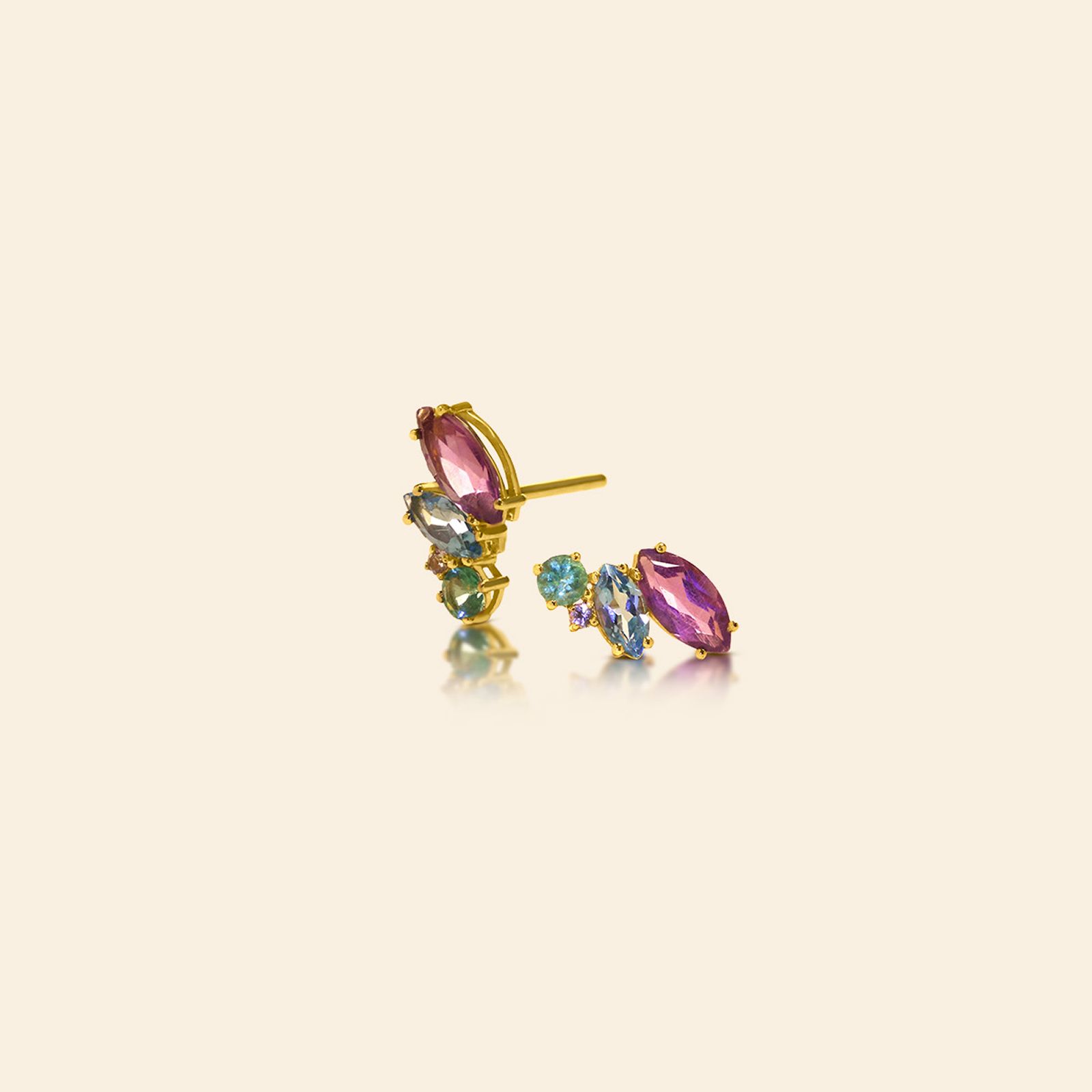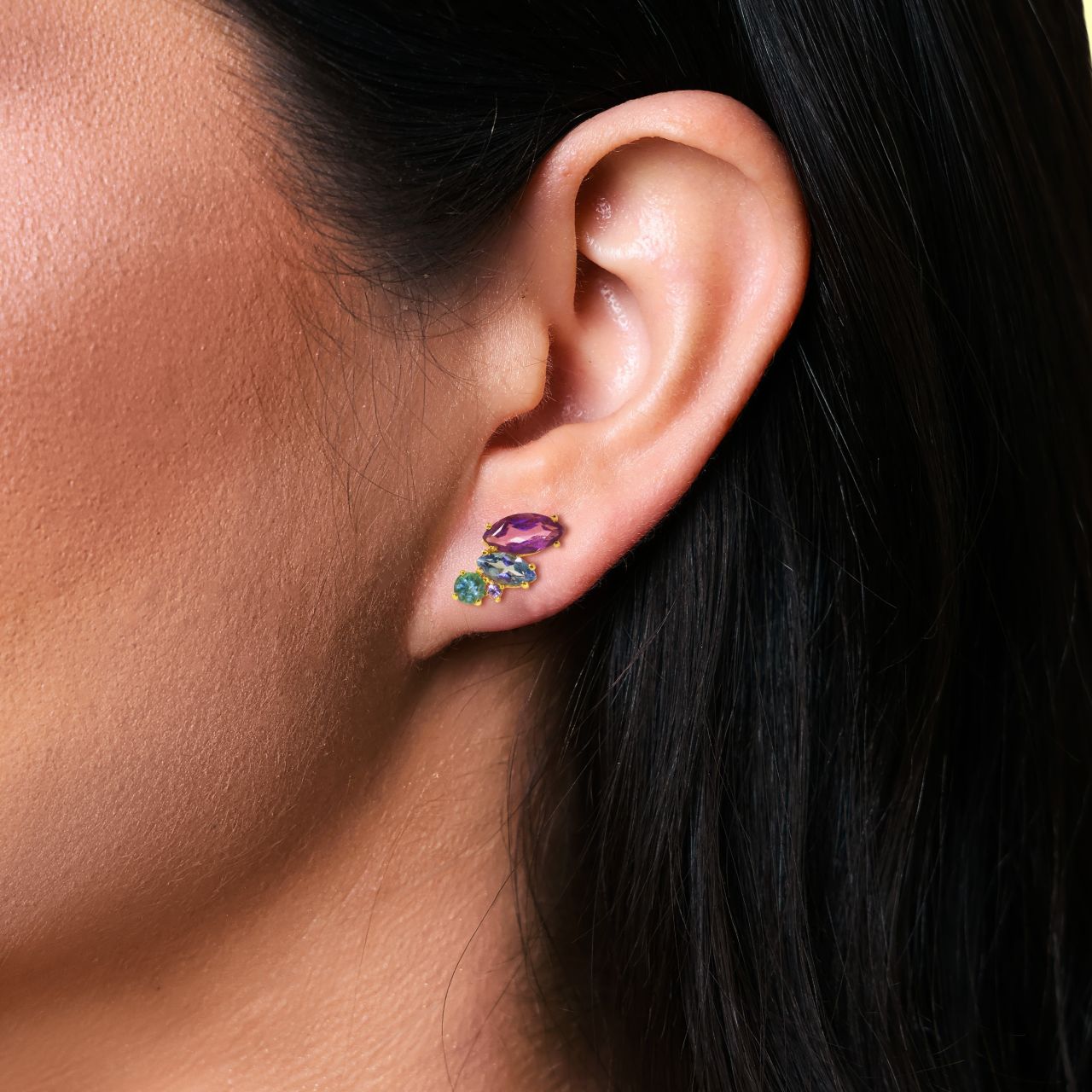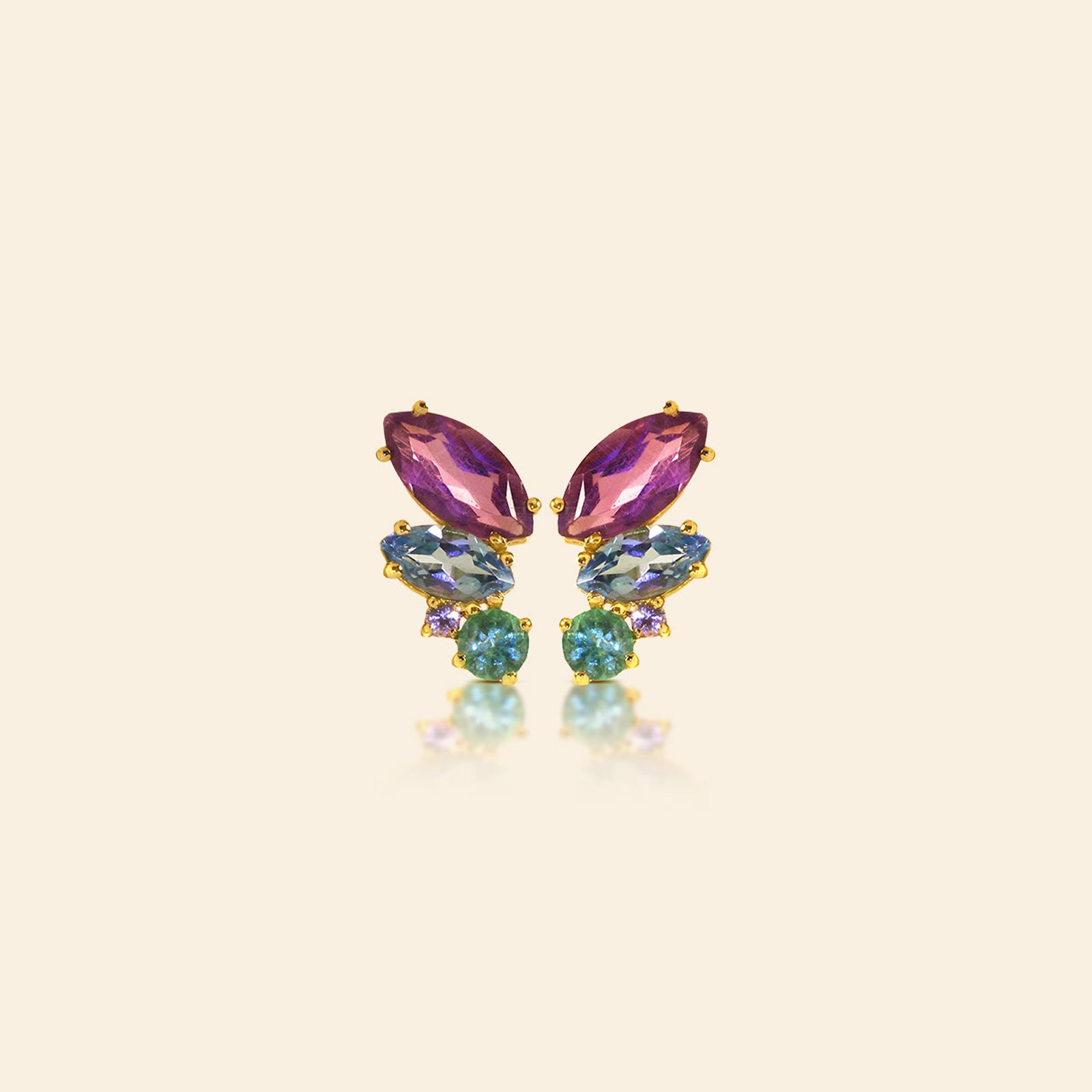 O Brinco Aurora Polares evoca a leveza e a cor do amanhecer em uma forma orgânica e feminina de borboleta. Em ouro 18k, une o brilho autêntico da ametista, esmeralda e topázio em uma composição autoral e sofisticada.
