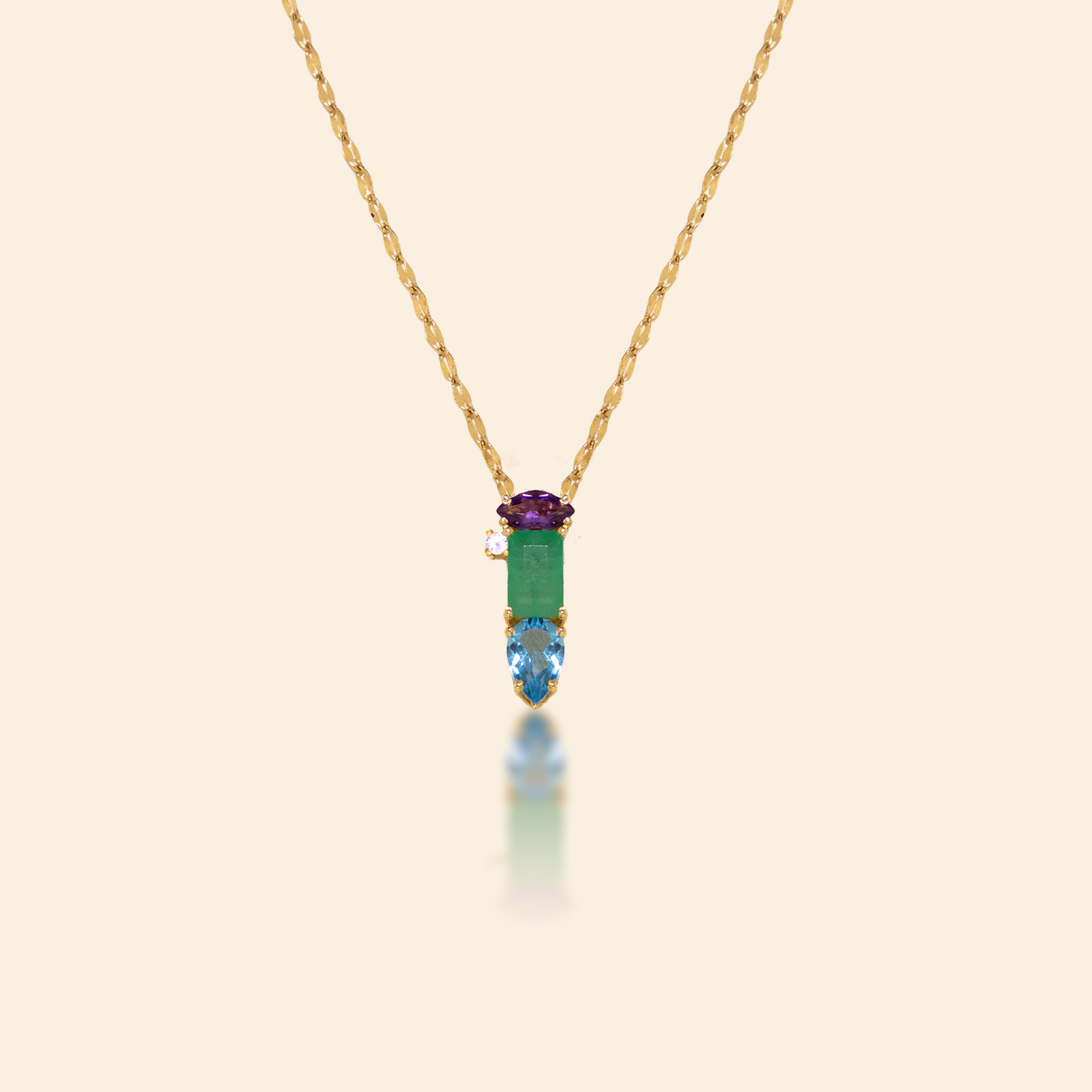 O Colar Aurora Ascendente acompanha uma sofisticada corrente singapura, finalizada com um pingente vertical composto por ametista, esmeralda, topázio swiss e um brilhante Topázio incolor.