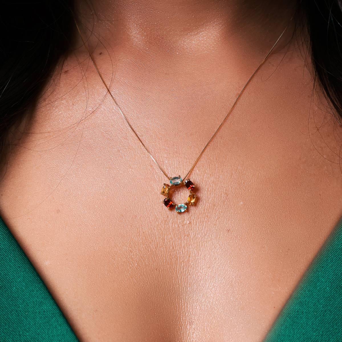 Colar Essenza Círculo de Luz em ouro 18k com citrinos, turmalinas rosas e topázios azuis, em pingente circular cravado com seis gemas naturais em lapidação baguete. Uma joia autoral que une cor e brilho em uma composição sofisticada.