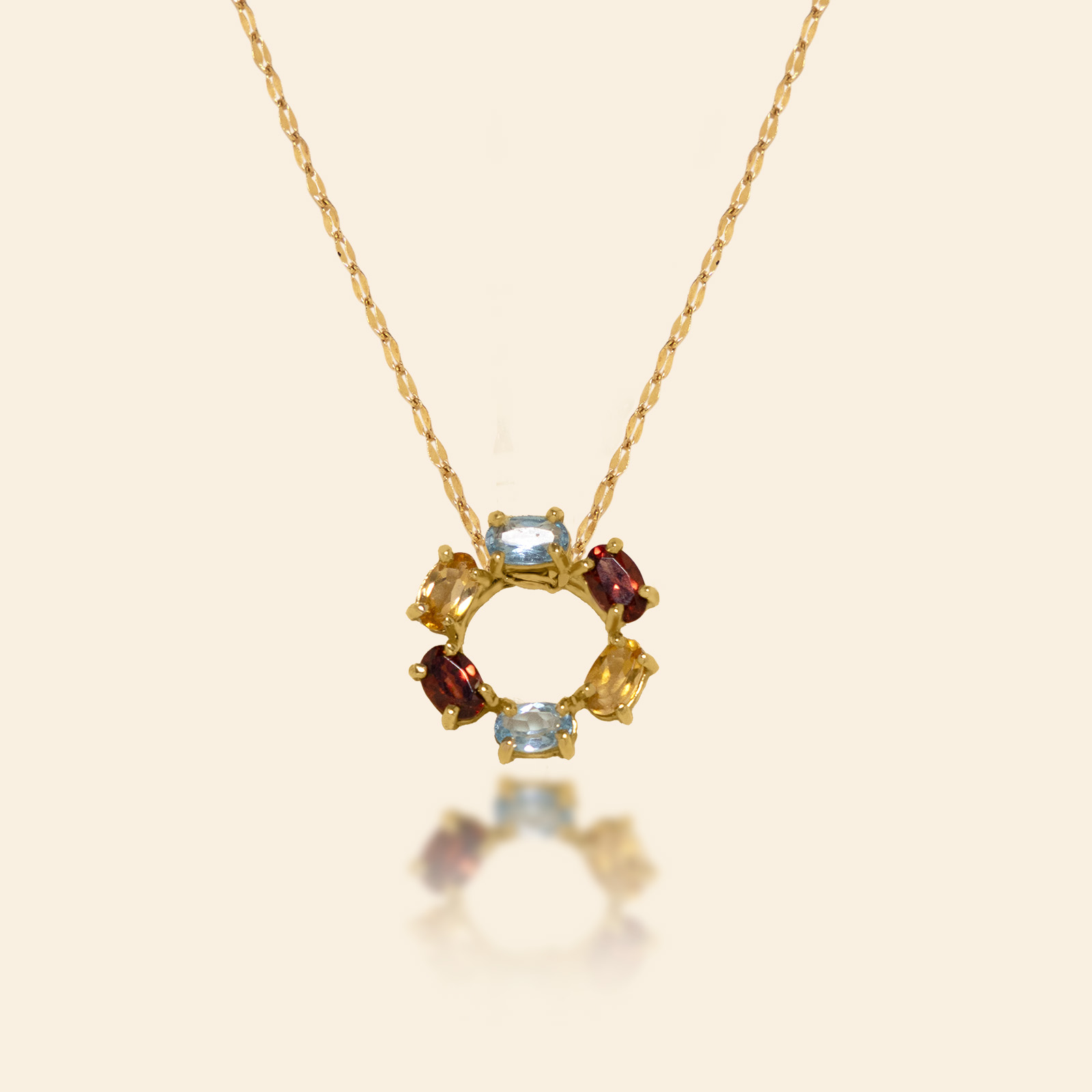 Colar Essenza Circulo de Luz foi desenhado para representar a eternidade e o movimento da luz ao amanhecer, o pingente organiza suas gemas harmoniosamente em carrossel, a alternância entre citrinos, turmalinas rosas e topázios azuis cria um jogo de luz sutil e refinado. O resultado é um brilho uniforme, contínuo e altamente sofisticado.